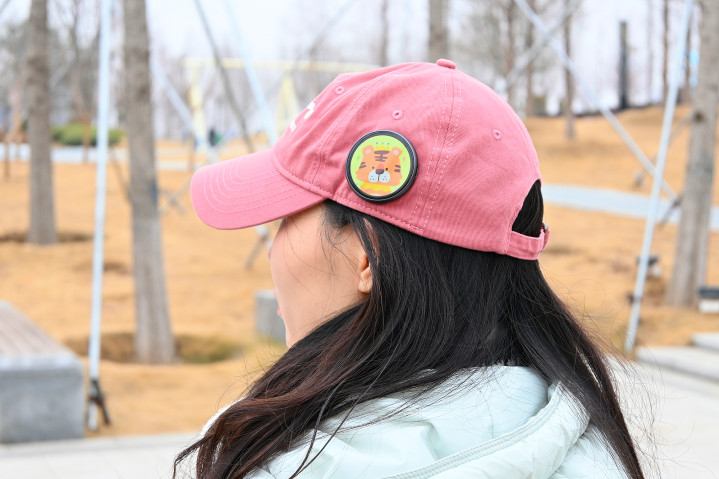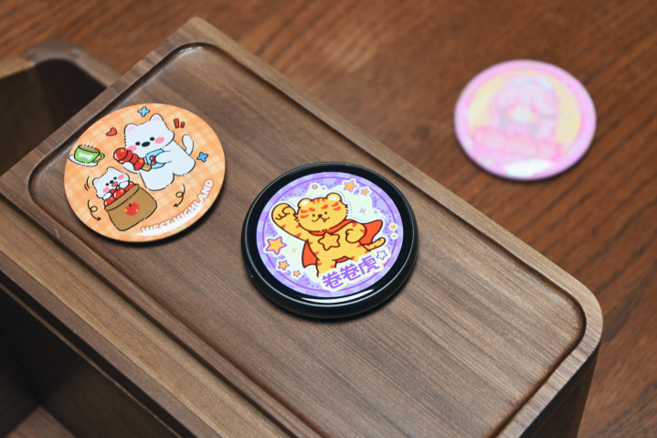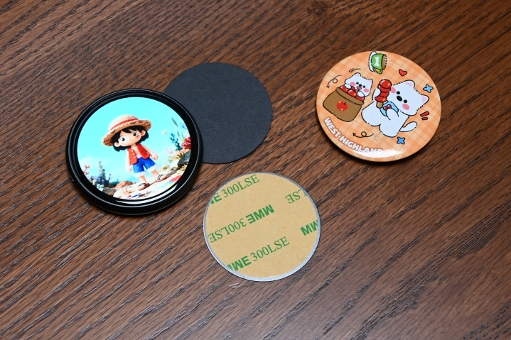 相较于传统吧唧的别针佩戴方式,PIXBADGE电子吧唧采用了更为简单直给的强力磁吸来解决。随机标配三枚引磁片,使用时只需将其靠近标配的引磁片,便可“啪”的一声牢牢吸附。实测在隔着一层衣物也能吸附得很稳当(机身后背有三块强力磁铁)。我们可以将其别在胸前,夹在背包上,甚至帽子或车内中控台旁的支架显眼位置。