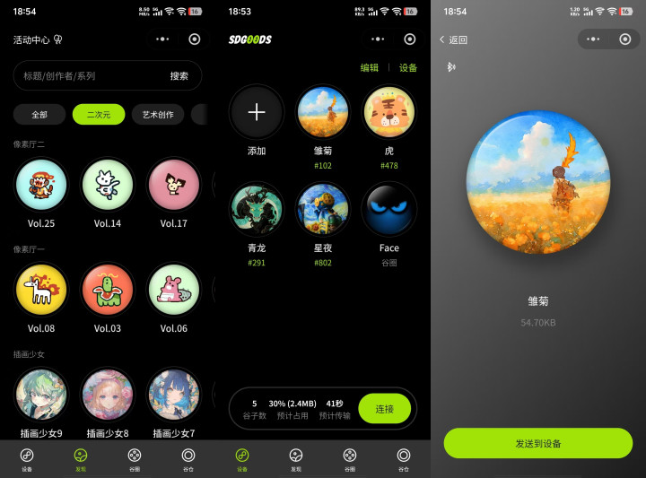 近年来的谷子经济,让“吧唧(徽章)”这种二次元衍生周边走向了更广阔的大众舞台,而电子吧唧做为其科技升级产物,相较于传统马口铁的静态展示摇身一变成为可以交互的数字载体。对于广大吃谷人来说,更是真正实现了谷子自由。一块高清屏幕就能装得下以前满包的IP图案,甚至是动态图、短视频。让人直呼“想换就换,快乐原竟如此简单”!